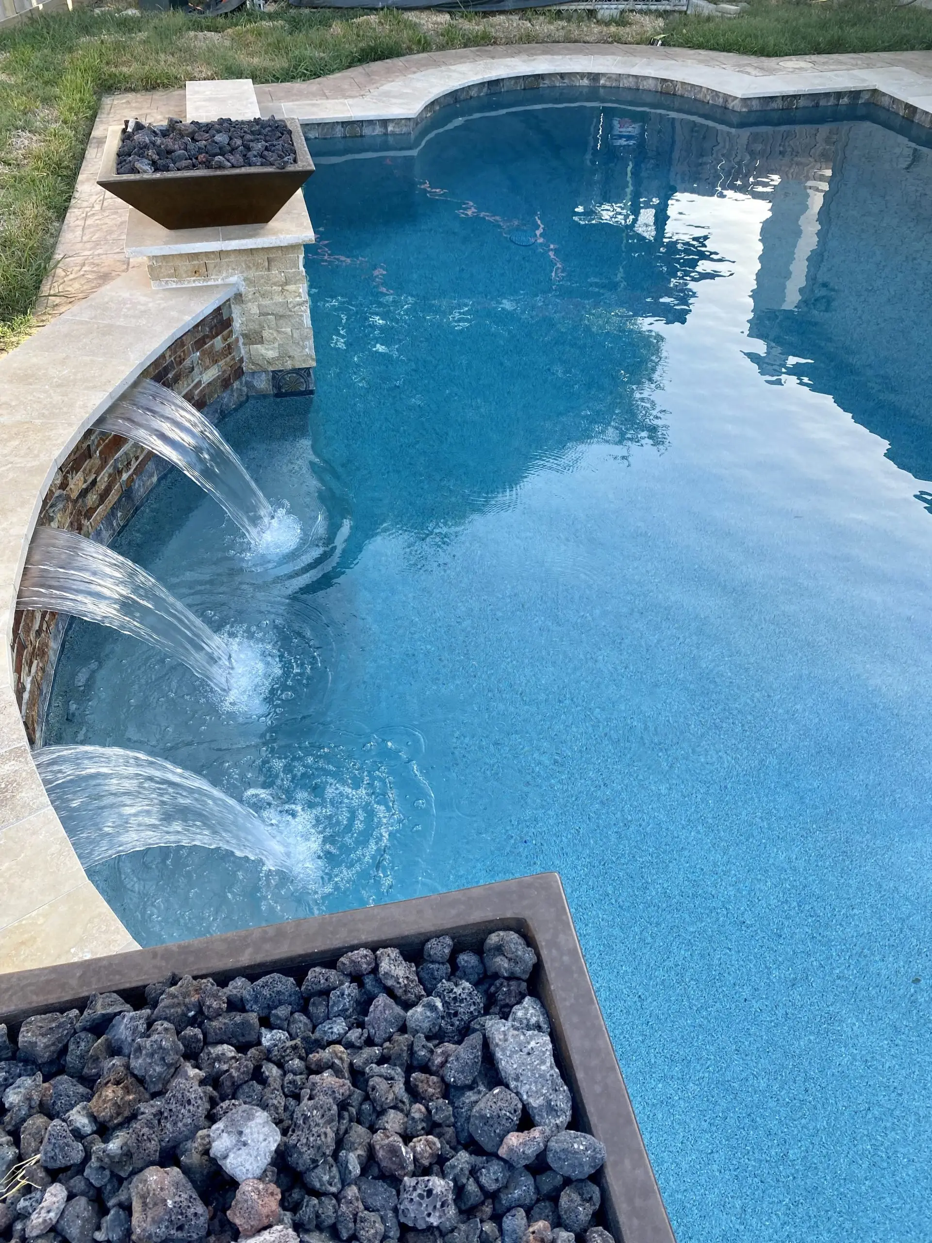 A luxurious backyard pool with cascading waterfalls and a decorative fire bowl filled with lava rocks.