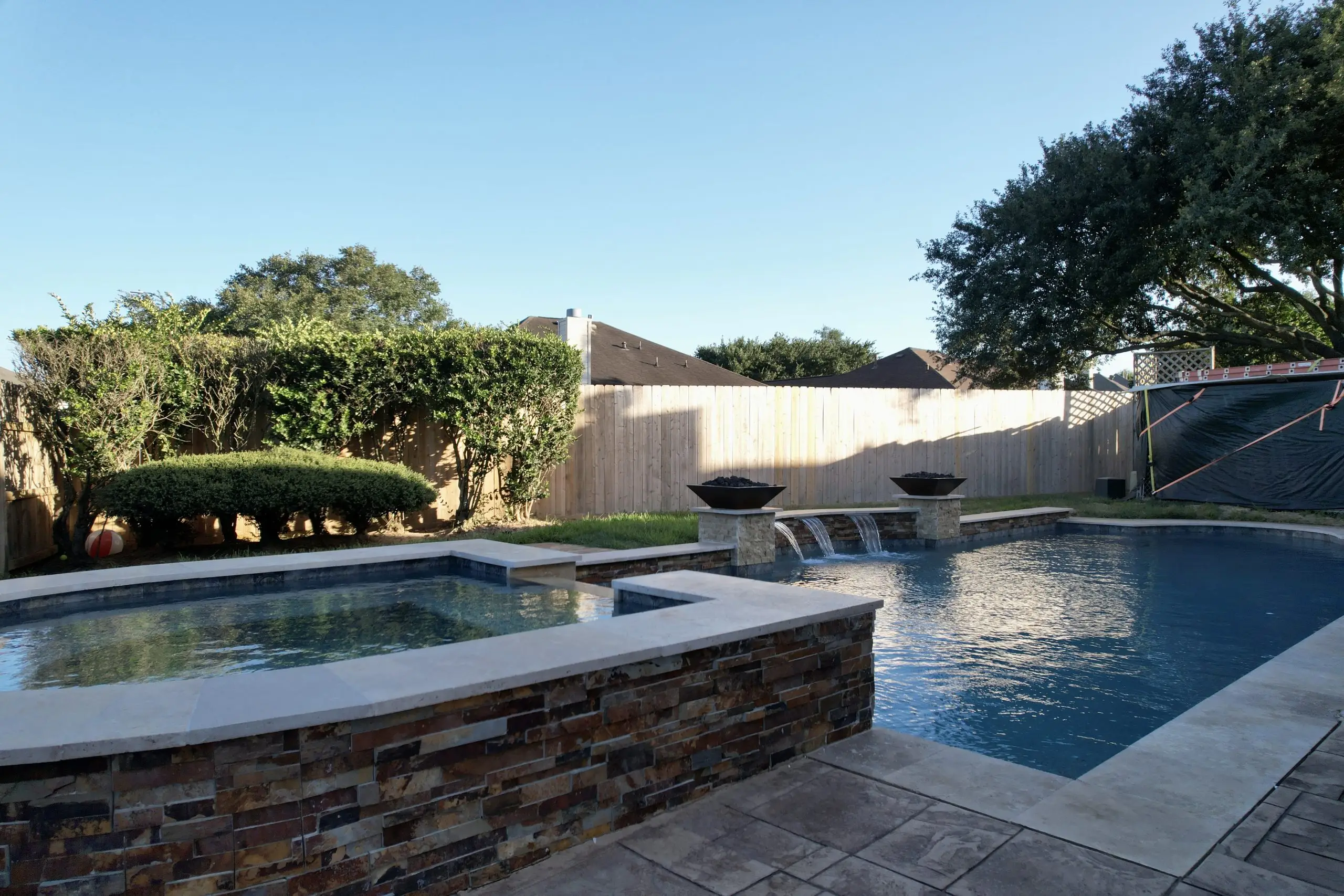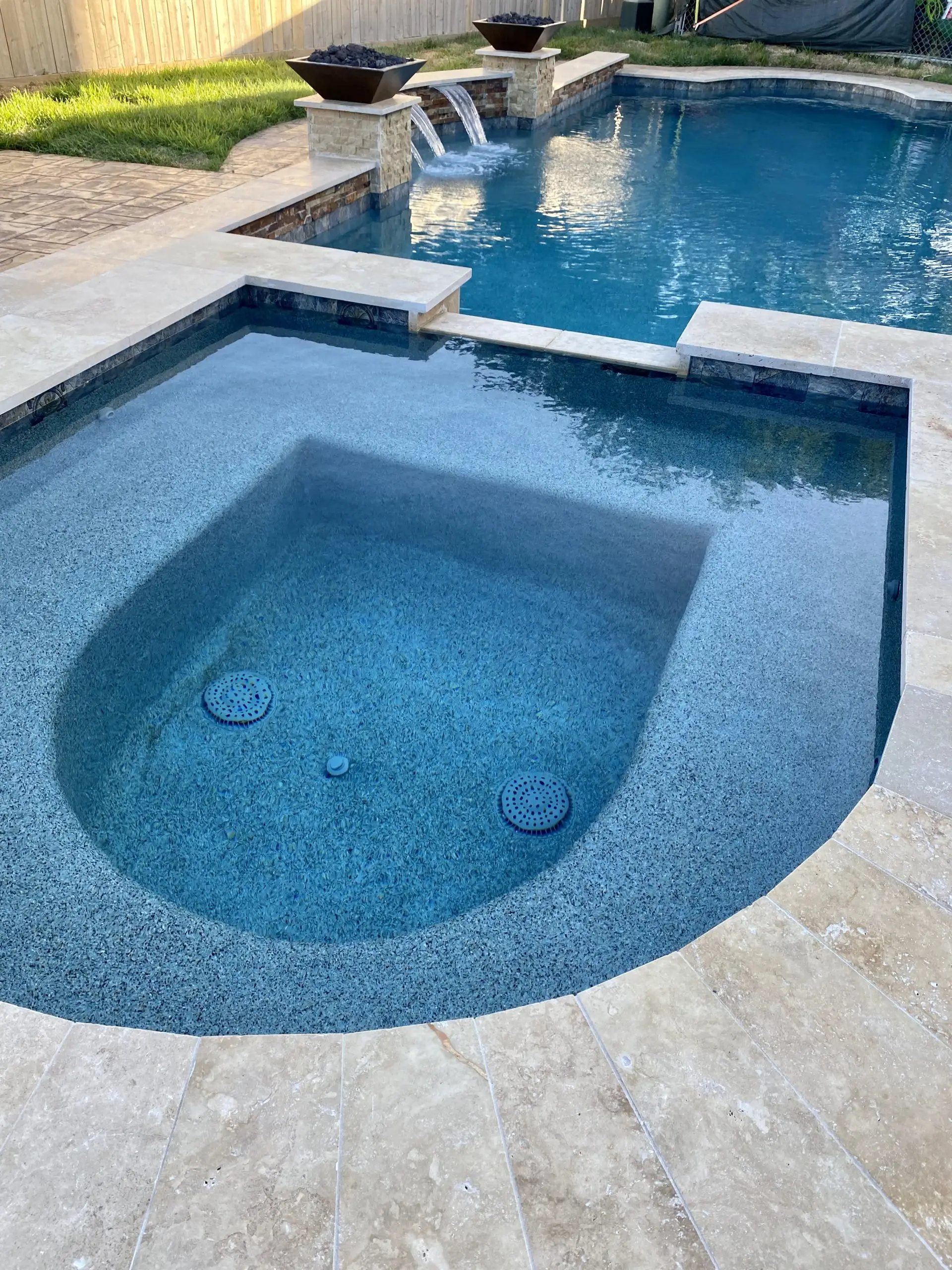A beautifully designed spa connected to a modern pool, featuring stone accents, fire bowls, and cascading waterfalls.