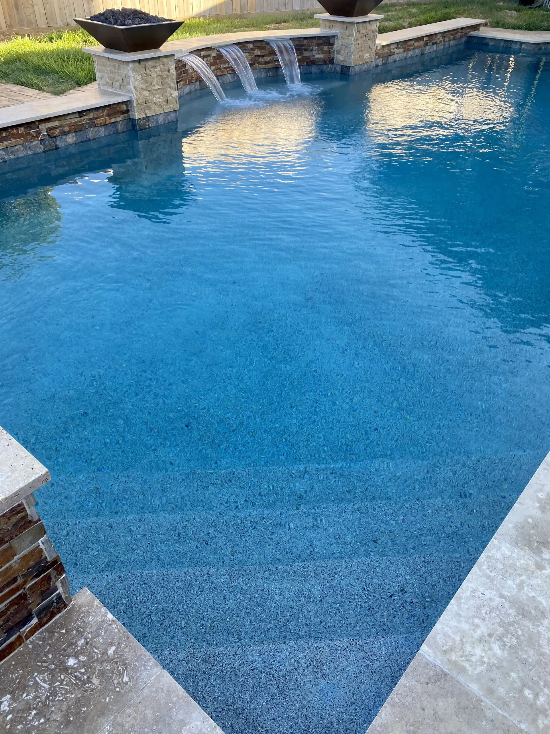 A luxurious backyard pool with three cascading water features and a decorative fire bowl on a stone pillar.