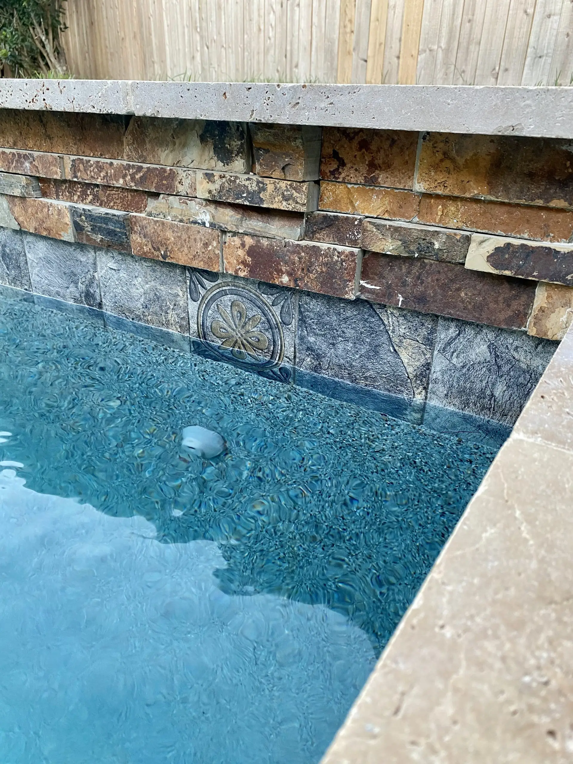 Close-up view of a swimming pool’s decorative tile and natural stone wall with intricate floral patterns.