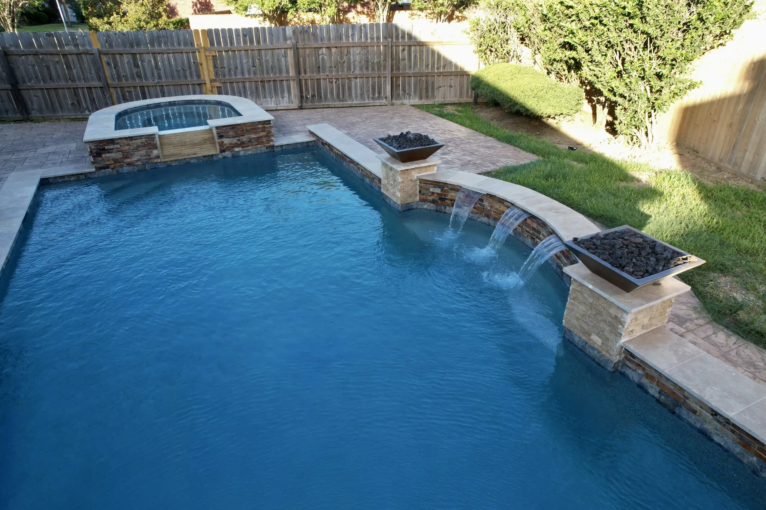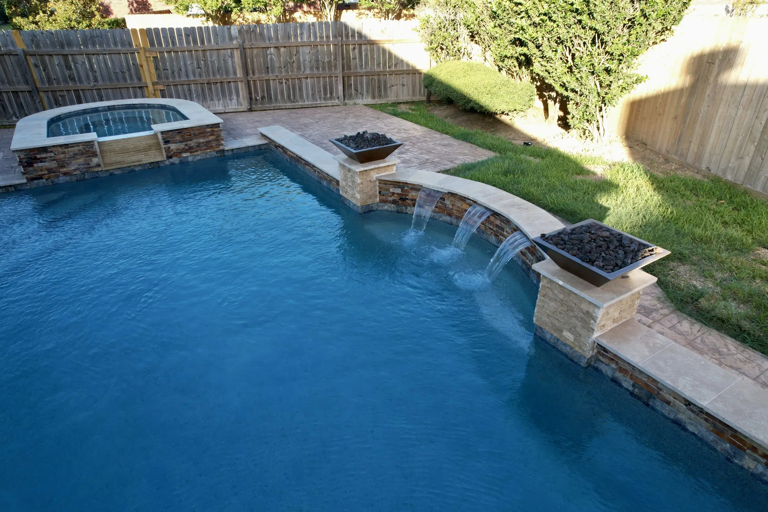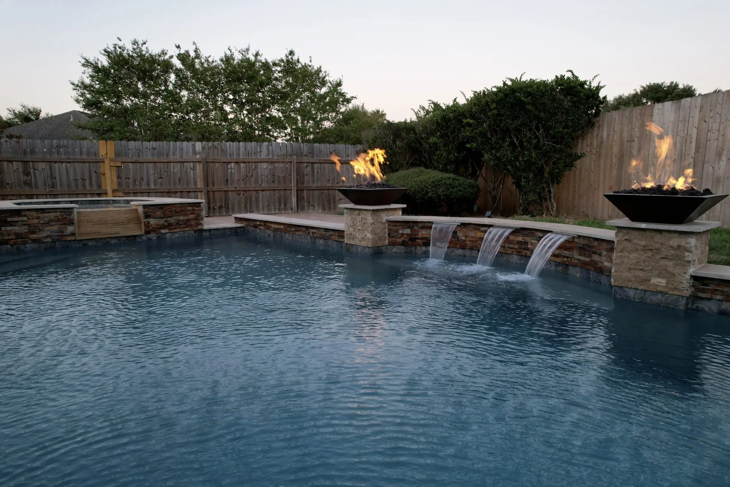 A stunning backyard pool with crystal-clear water, fire bowls, and a raised spa with a cascading waterfall.
