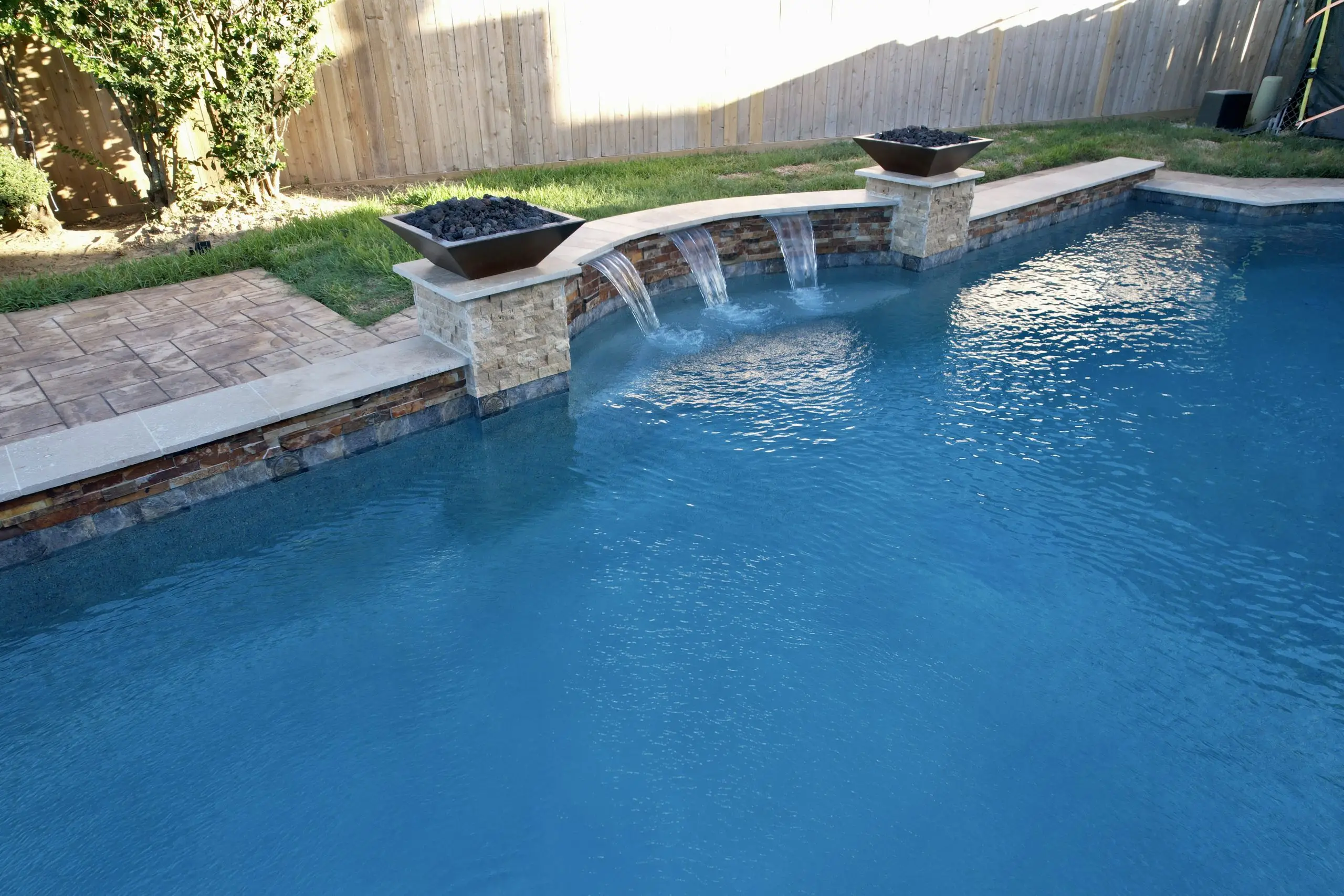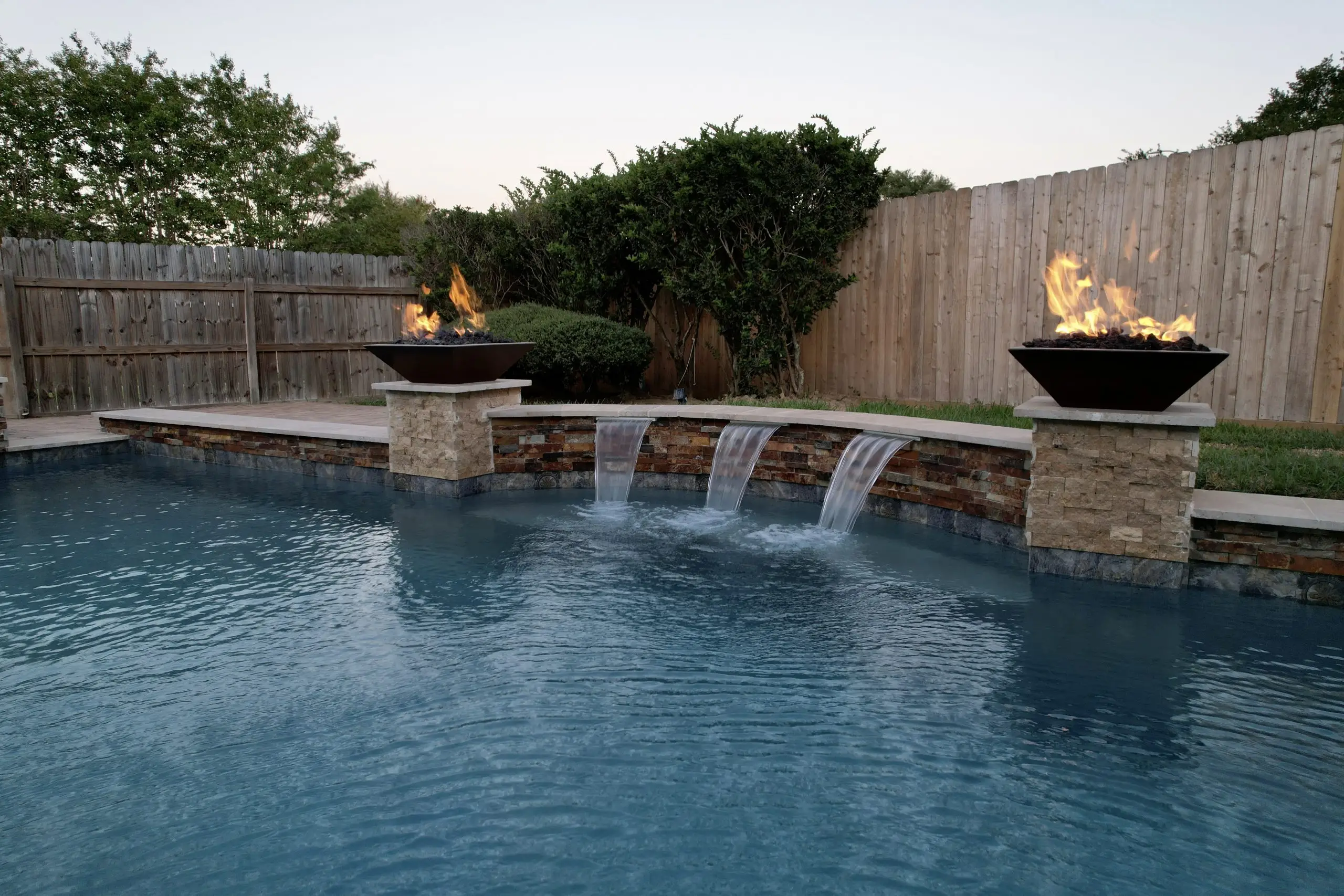 A serene backyard pool with fire bowls, cascading water features, and elegant stone tile decking.
