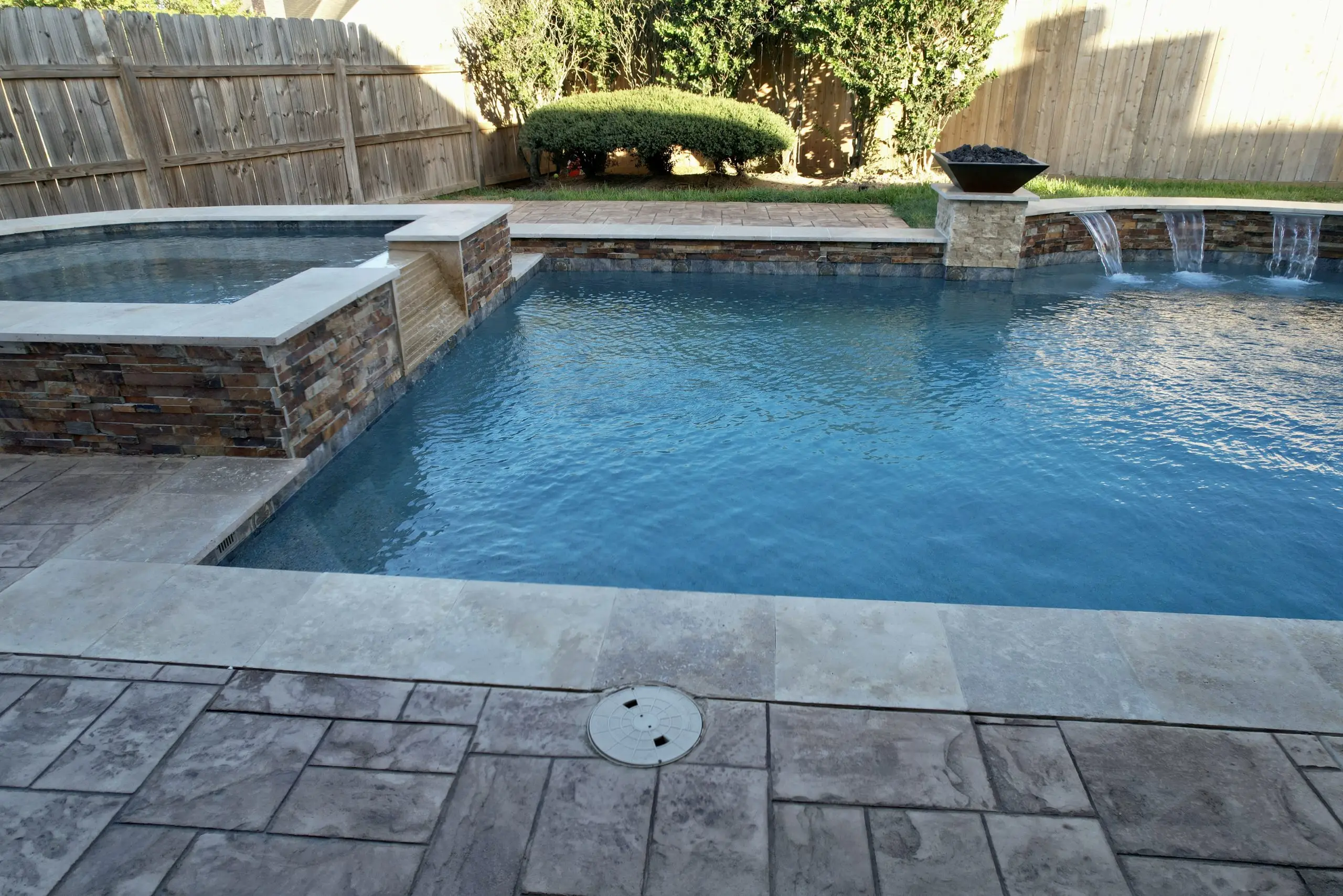 A beautifully designed spa and pool combination with stone accents, fire bowls, and a tranquil water feature.