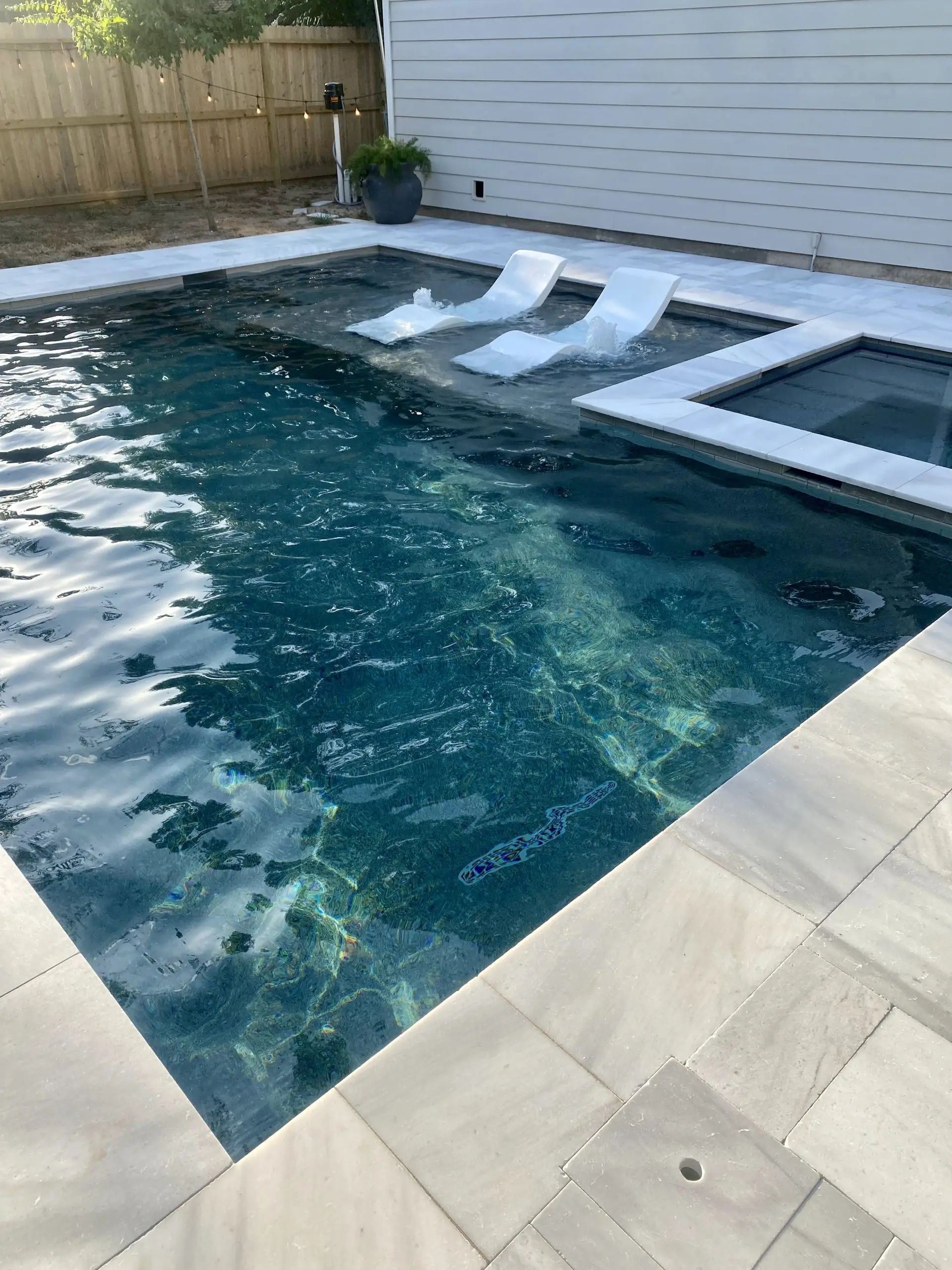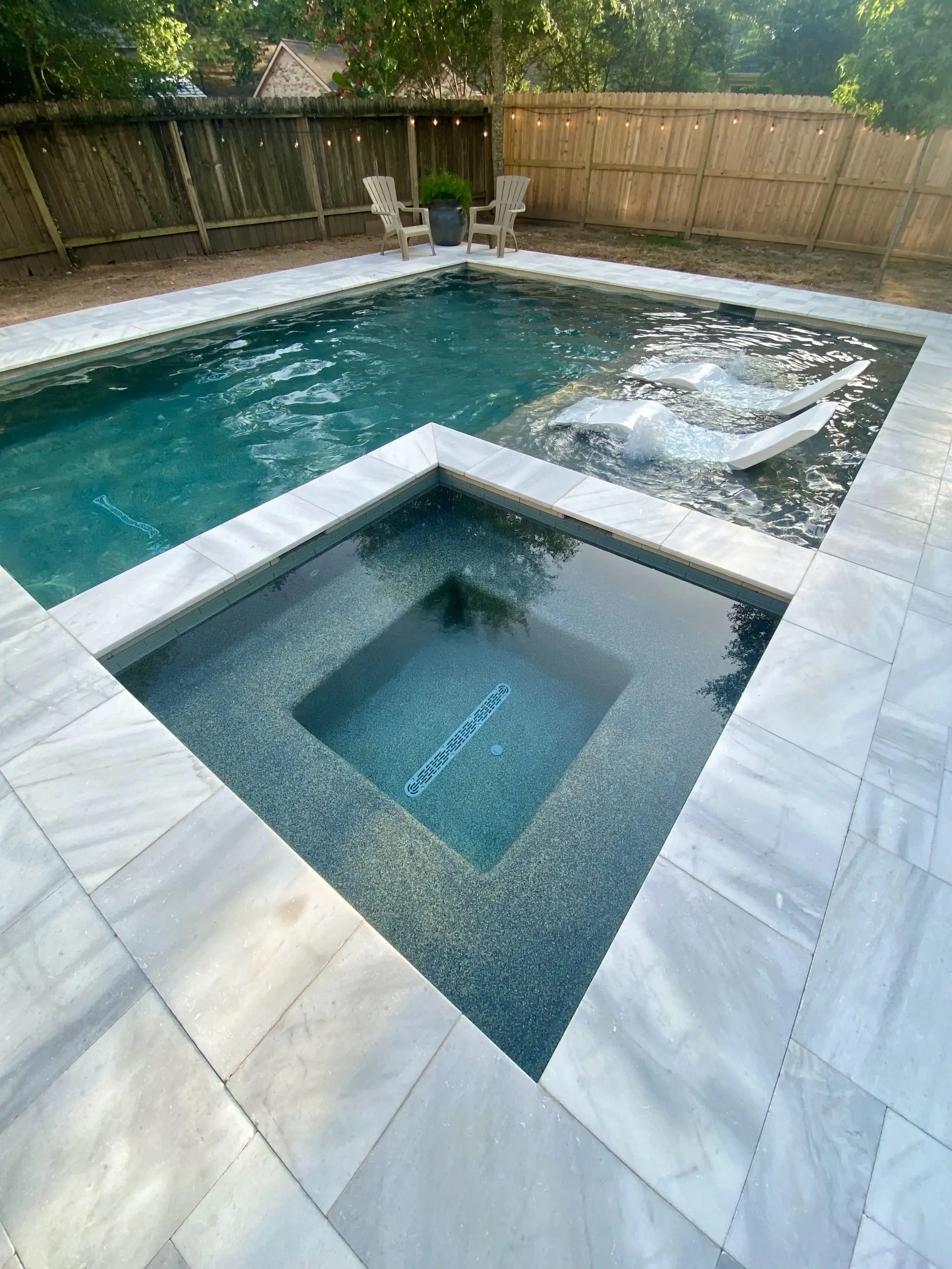 A modern backyard pool with a built-in spa, marble decking, and in-water loungers for relaxation.
