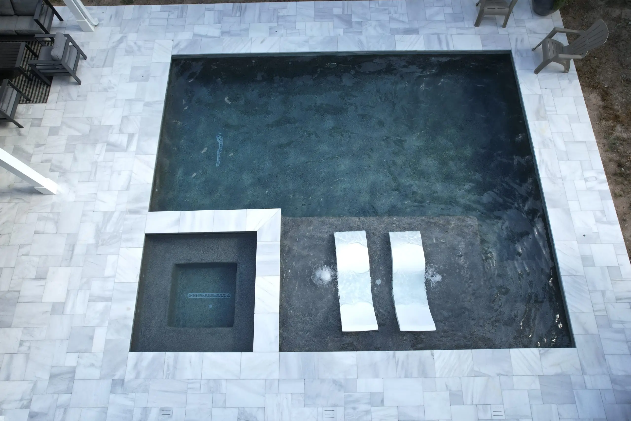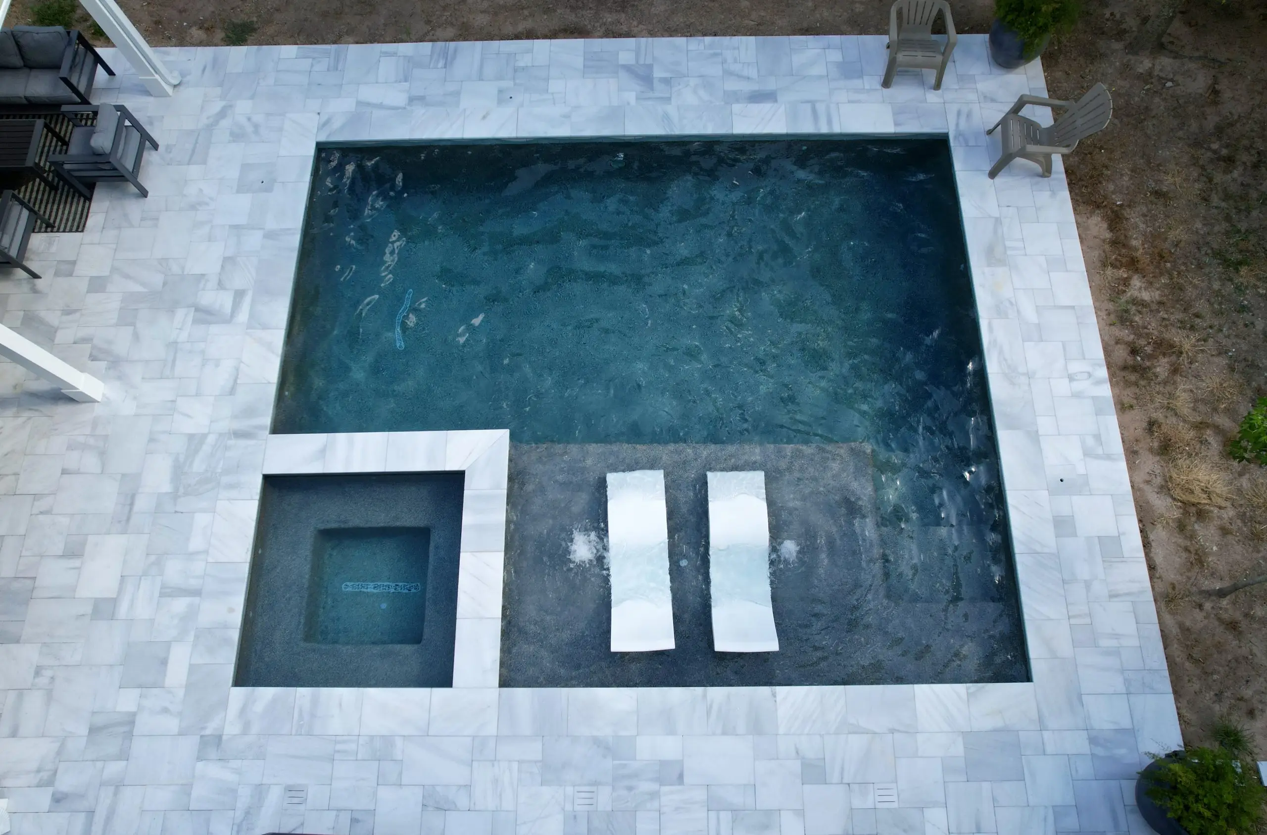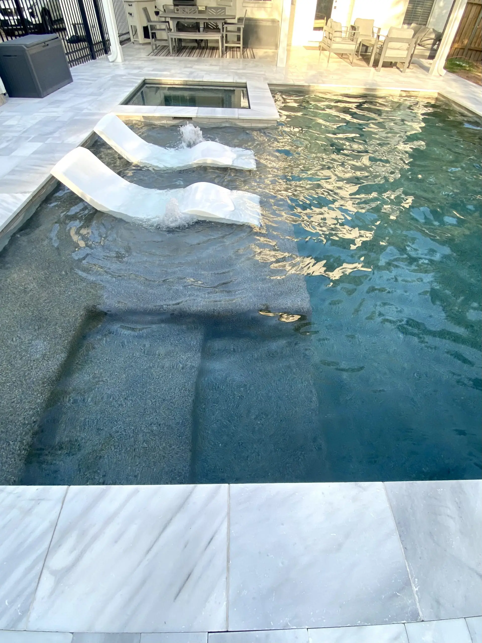 Elegant backyard pool with a built-in spa, marble tile decking, and two white lounge chairs on a bubbling tanning ledge.