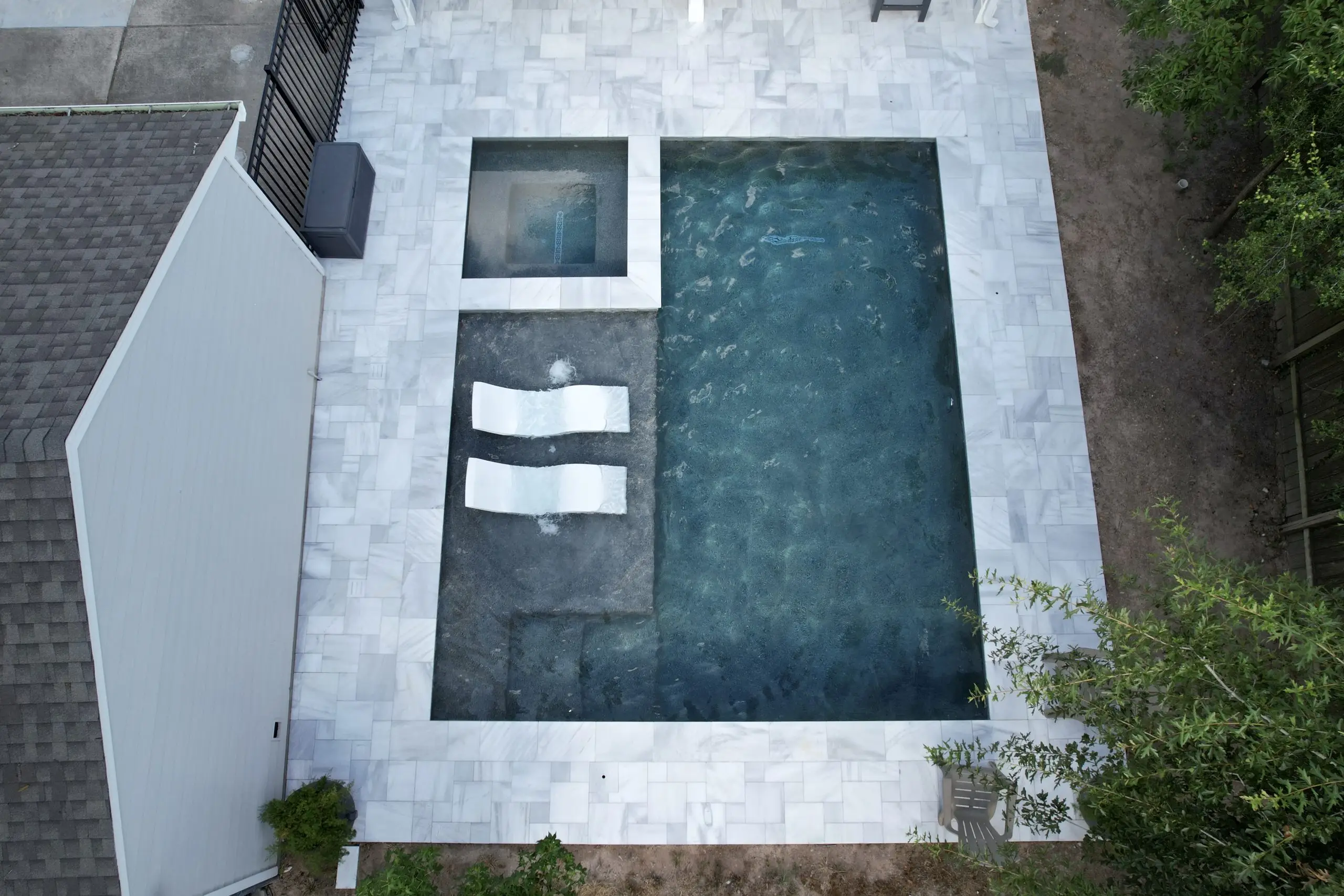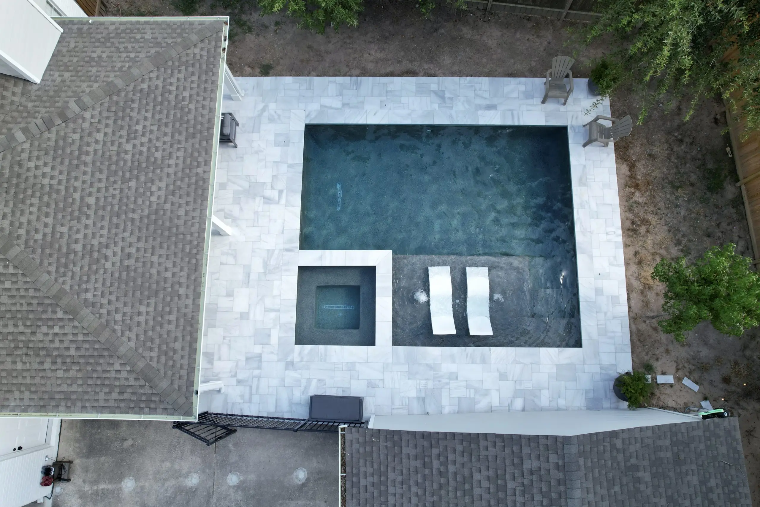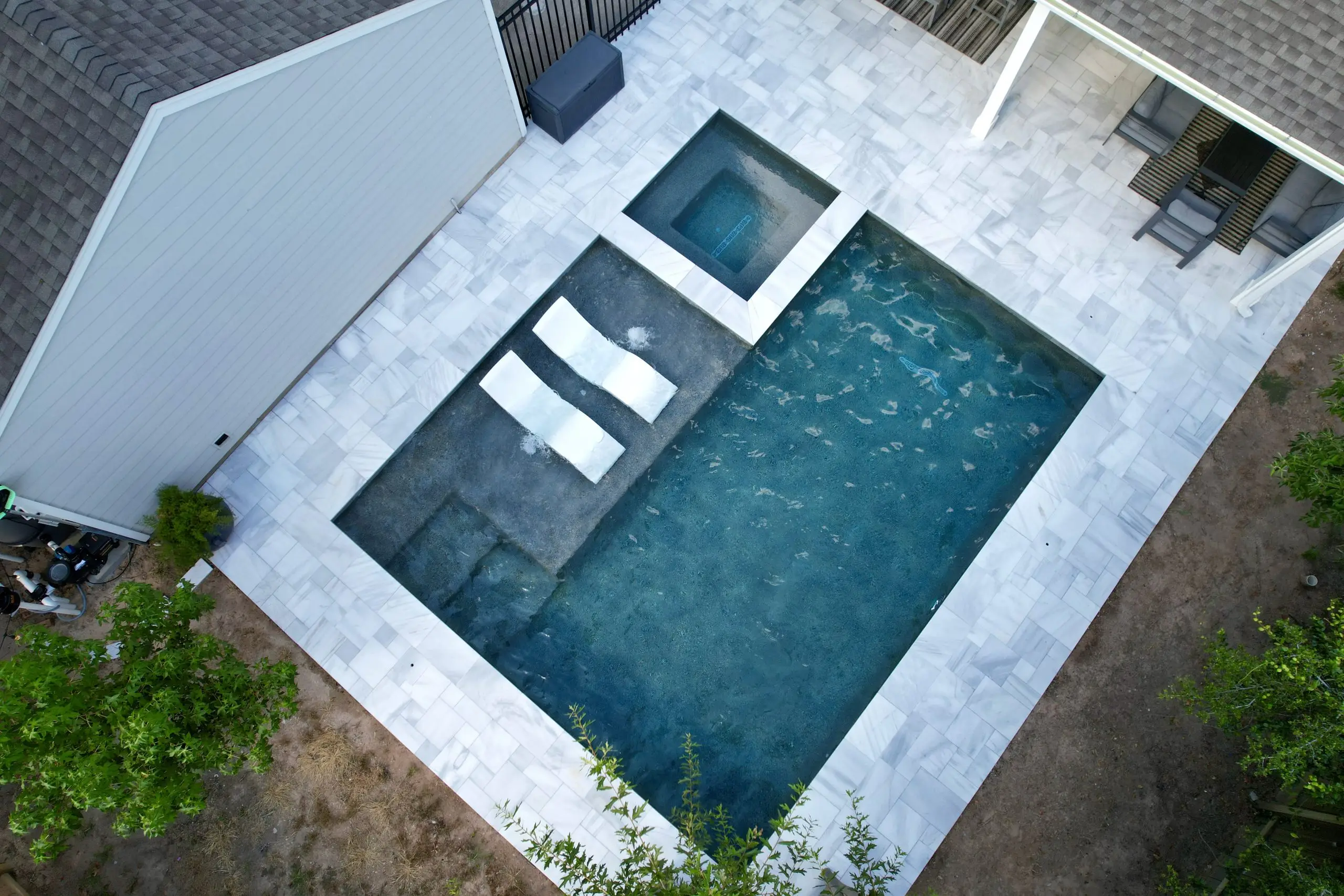 A luxurious backyard pool with a built-in spa, tanning ledge, and marble tile decking, viewed from above.