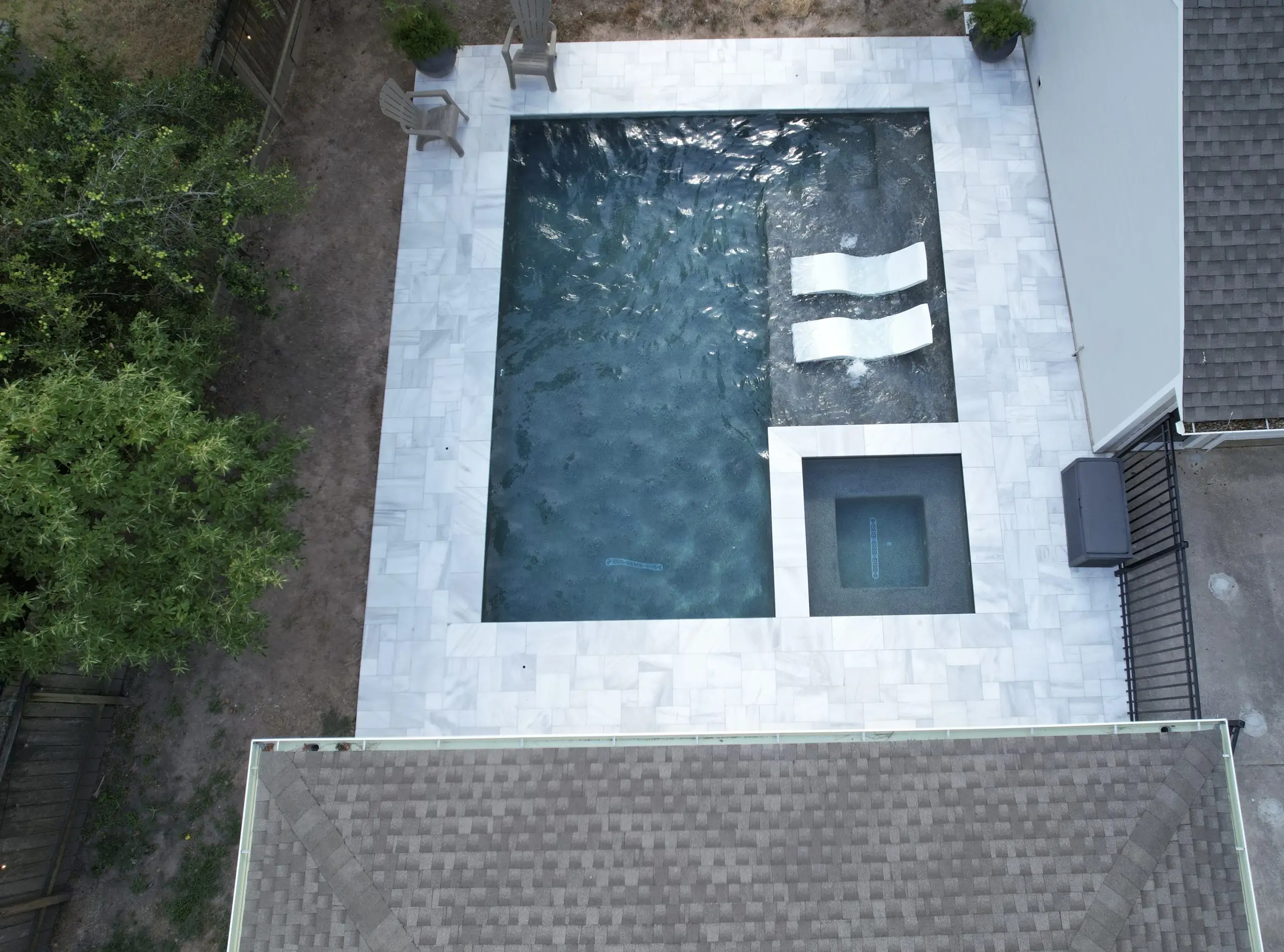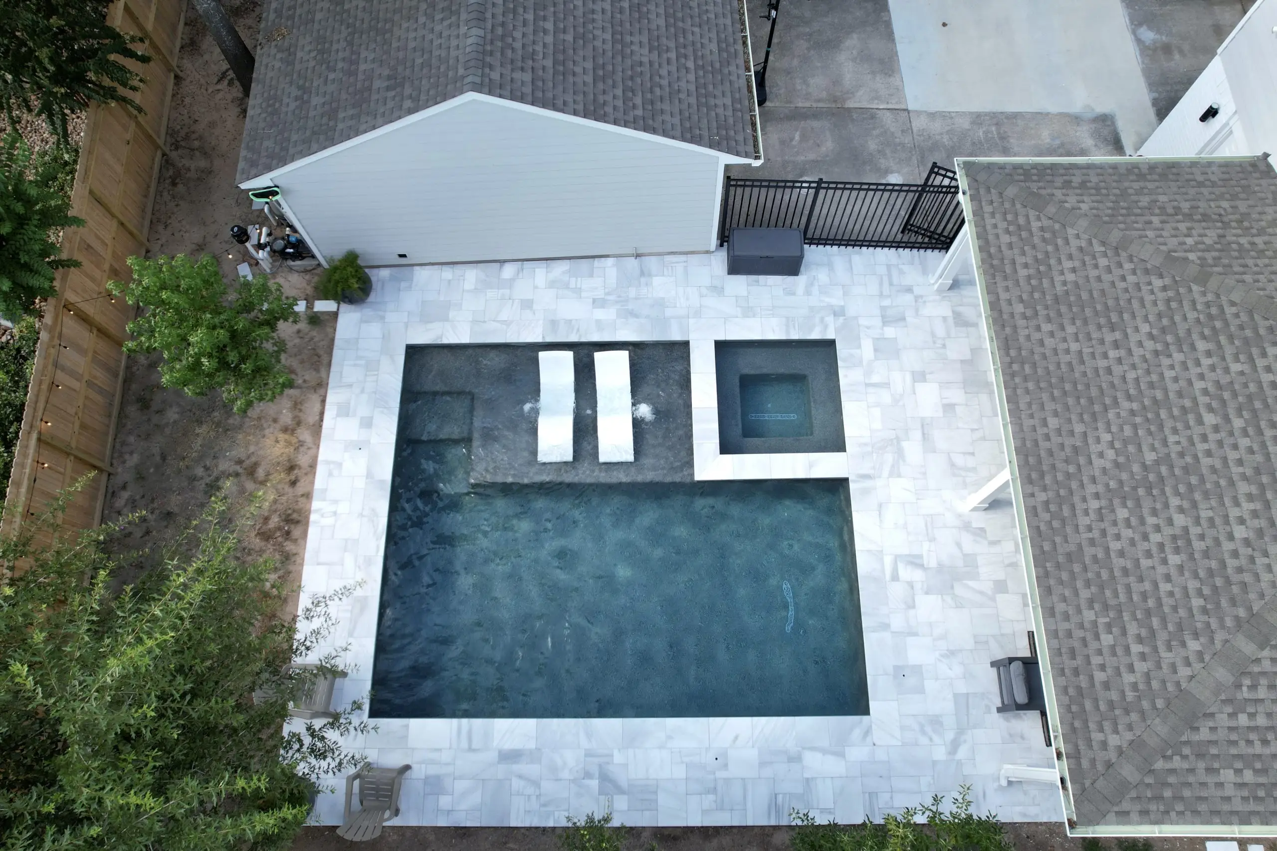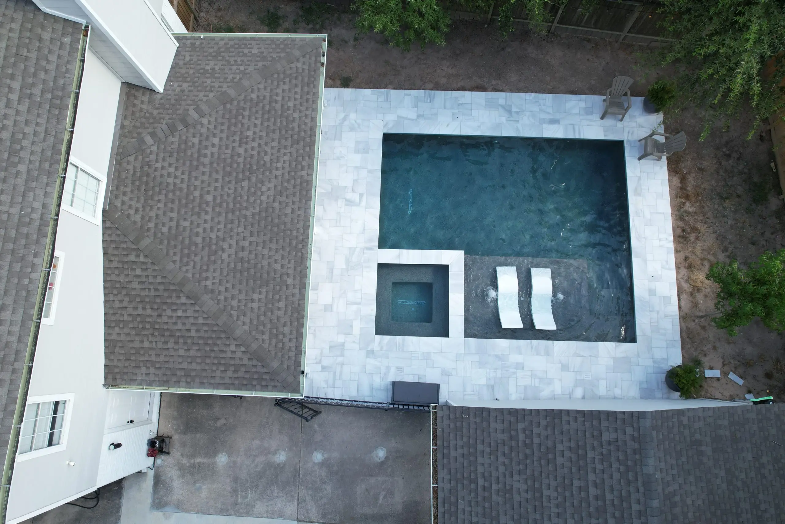 A luxurious backyard pool with a built-in spa, tanning ledge, and marble tile decking, viewed from above.