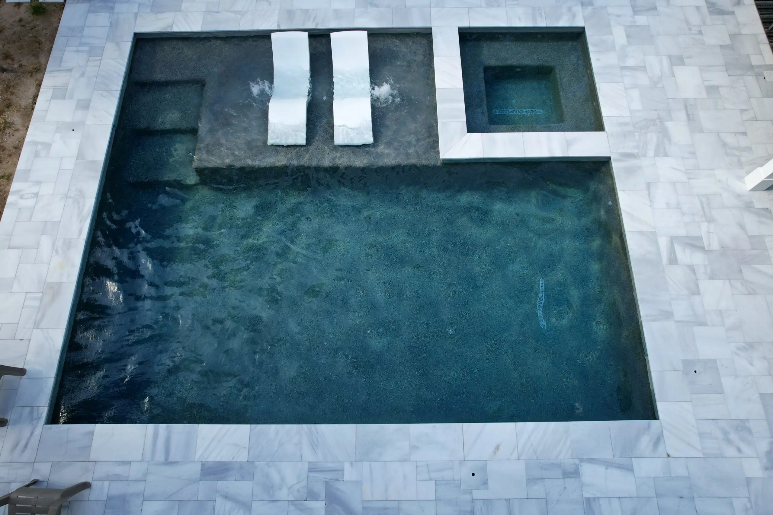 Aerial view of a sleek modern swimming pool with a built-in spa, tanning ledge, and marble tile decking.