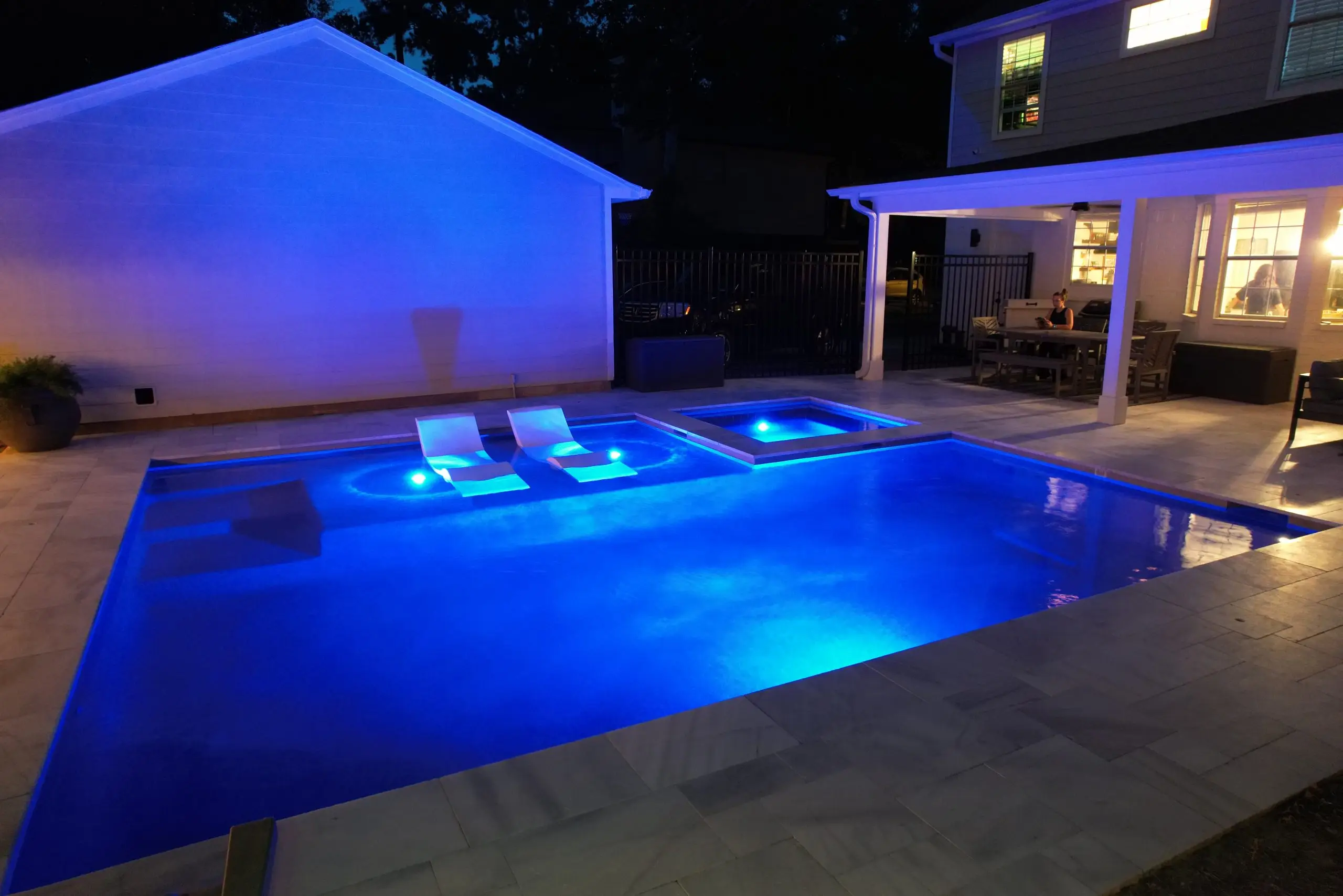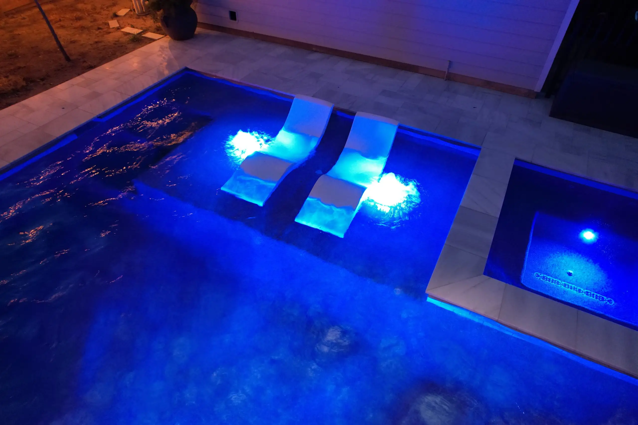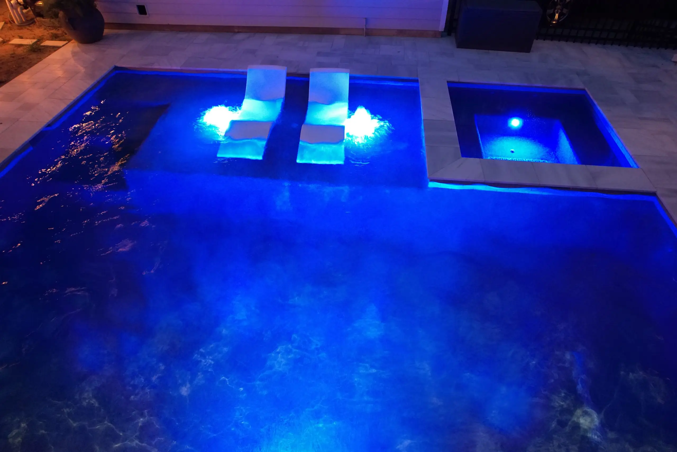 A luxurious backyard pool illuminated with blue LED lights at night, featuring in-water loungers and a built-in spa.